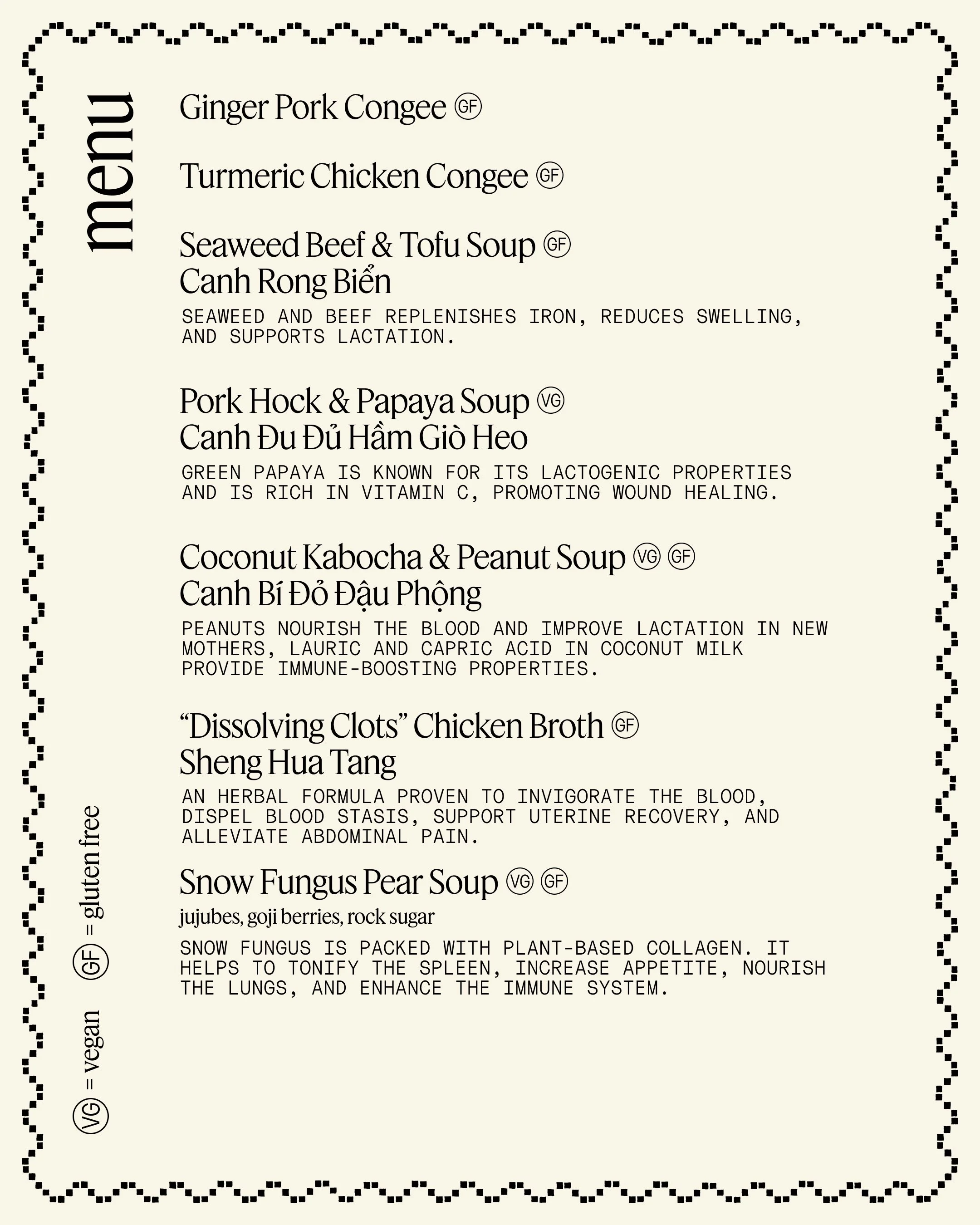 A postpartum meal plan that is designed to feed a recovering mother for 7 days. Dishes are rooted in traditional Vietnamese medicine and are meant to be enjoyed with rice. Ingredients are pasture-raised, locally-sourced, and organic wherever possible.